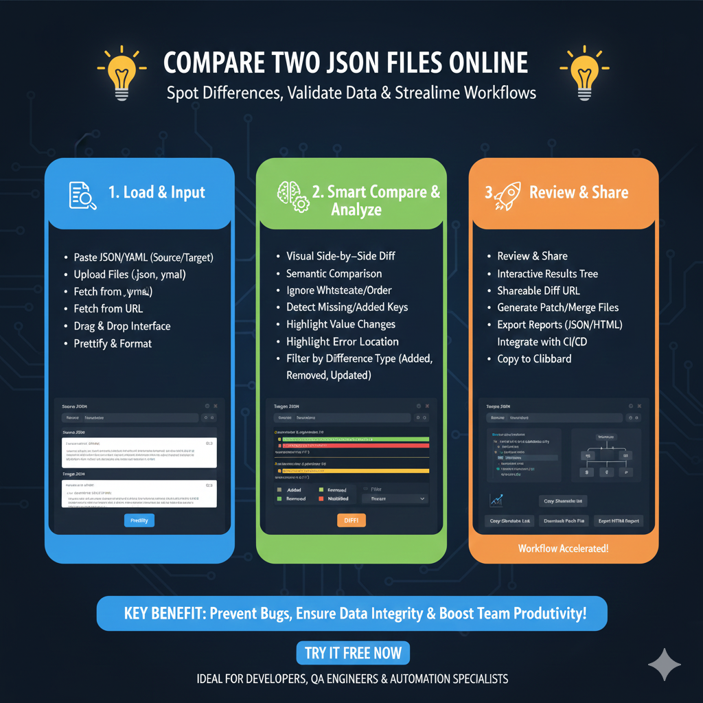 The infographic titled “COMPARE TWO JSON FILES ONLINE: Spot Differences, Validate Data & Streamline Workflows” outlines a professional process for identifying discrepancies between data sets through an intuitive online interface.
