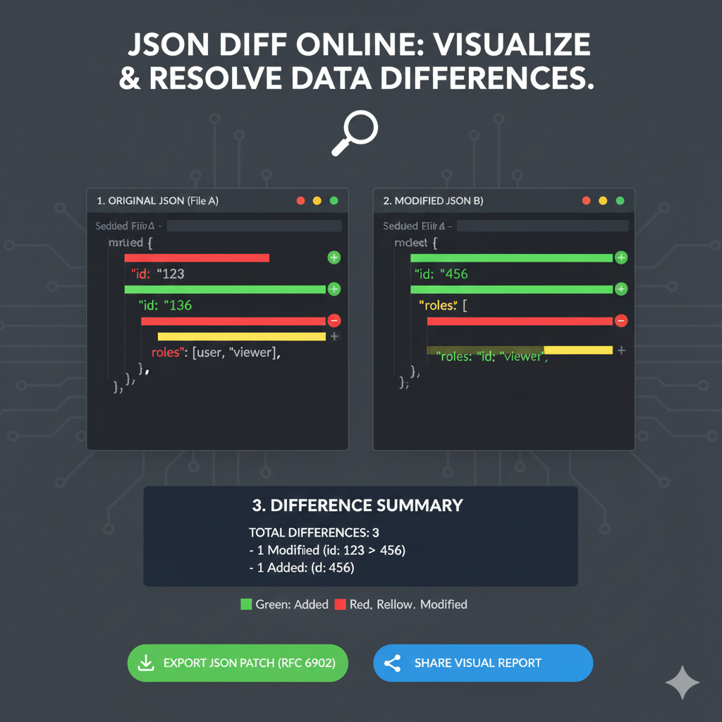 An online JSON diff tool is a web-based utility designed to visually compare two JSON inputs (JSON files, strings, or $\text{URLs}$) and highlight their differences. It helps developers, testers, and data analysts quickly pinpoint additions, deletions, and modifications, making the process of debugging, merging, and verifying data much more efficient. This is the ultimate json compare online tool.