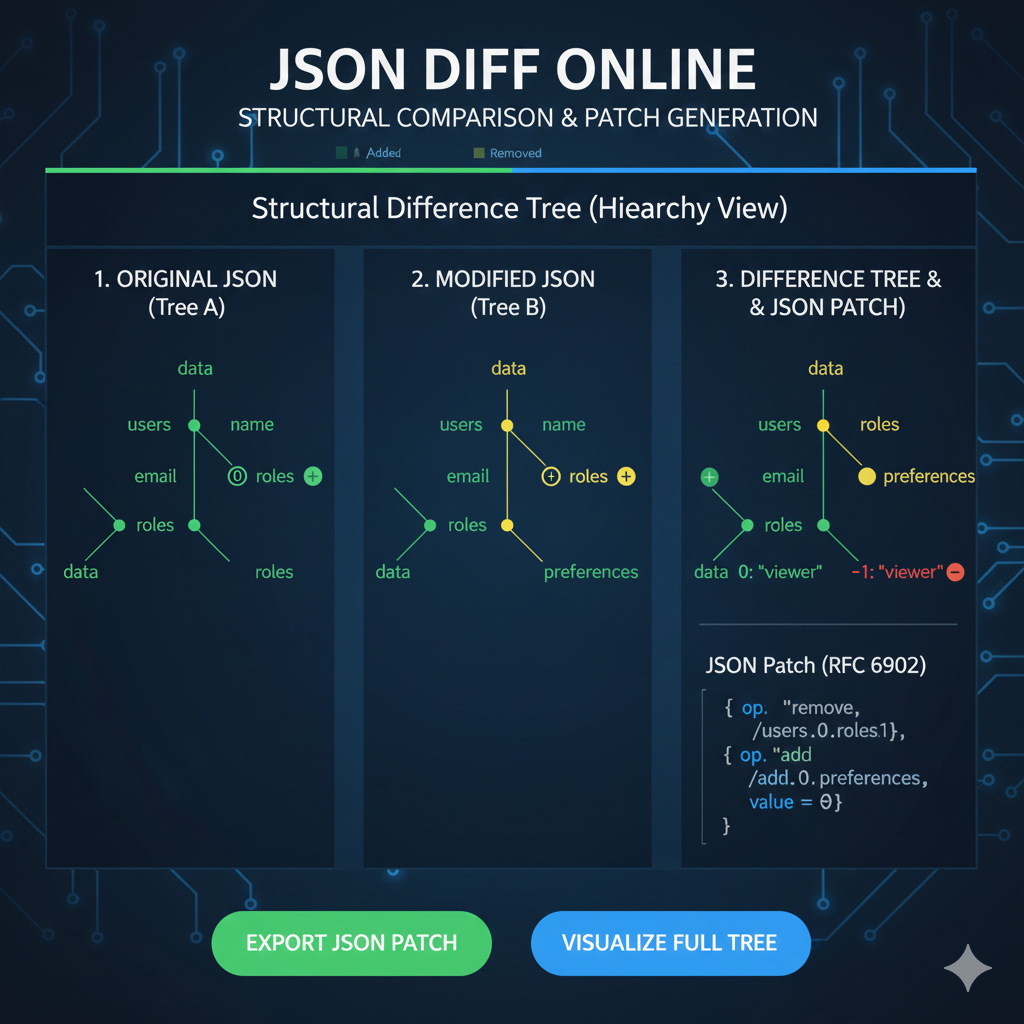 The image provided is an infographic titled “JSON DIFF ONLINE: STRUCTURAL COMPARISON & PATCH GENERATION”. It illustrates the concept of the Structural Difference Tree for comparing two JSON documents and generating a standard JSON Patch.